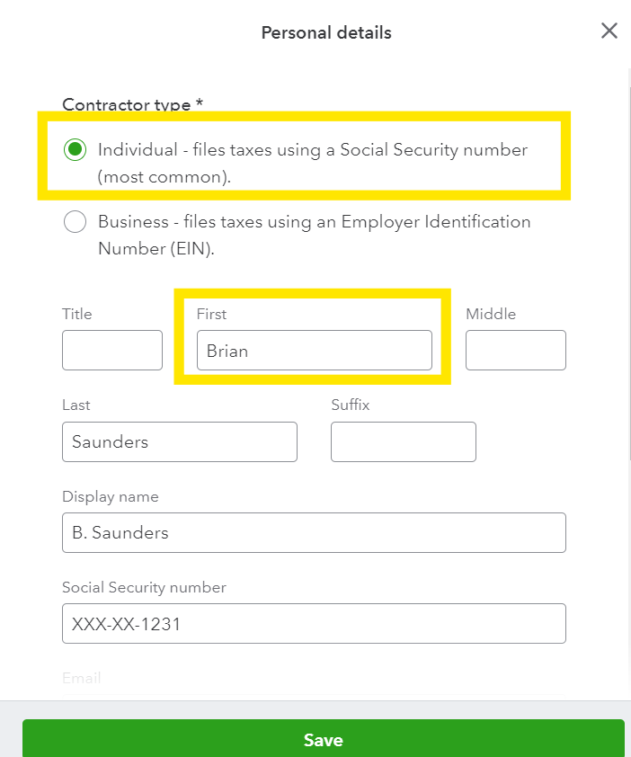Contractors must be entered as an Individual in QuickBooks Online in order to be synced to HTS.